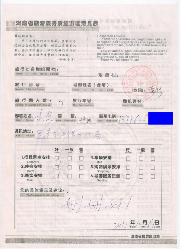 天津青先生一行7人旅游質量回饋