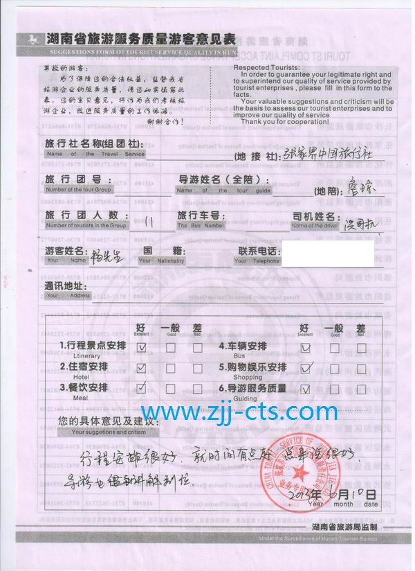 寧夏楊先生一行11人旅游質(zhì)量回饋單